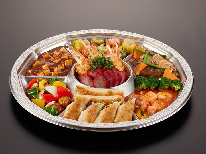 四川式麻婆豆腐 、ミルク伊達巻 、栗入り伊達巻 、クラゲ冷製 、釜焼き叉焼、大海老チリソース煮 、鶏もも肉香味焼き 、胡瓜甘酢漬け 、白菜甘酢漬け 、酢豚 黒香酢風味 、栗甘露煮