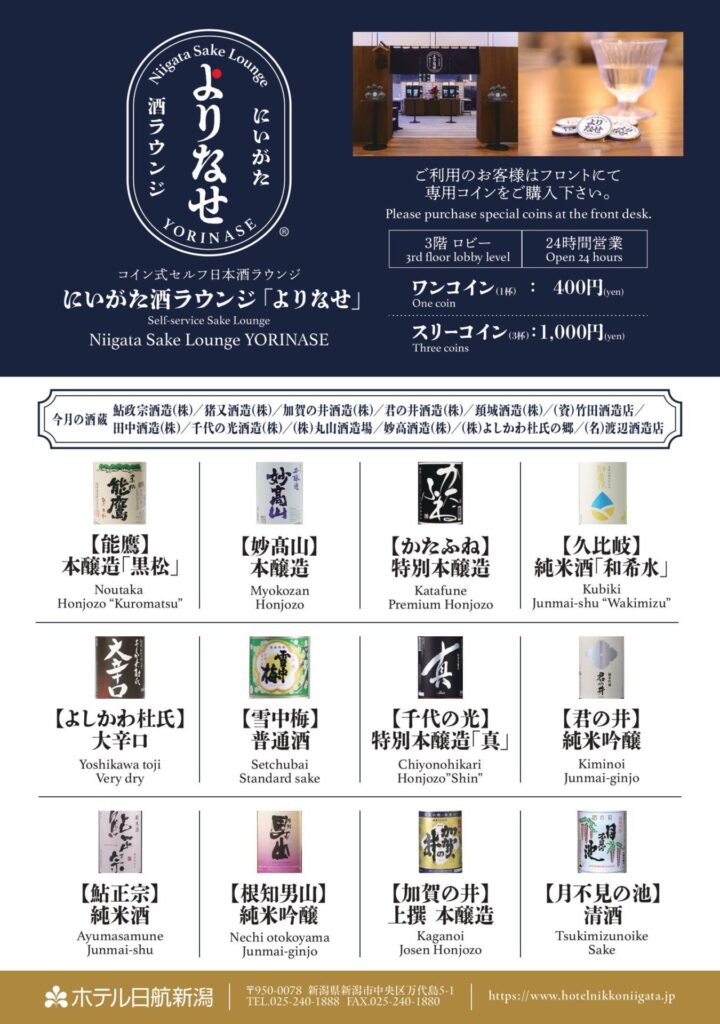 - 場所:ホテル日航新潟 3階「にいがた酒ラウンジ よりなせ」