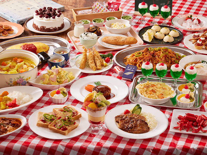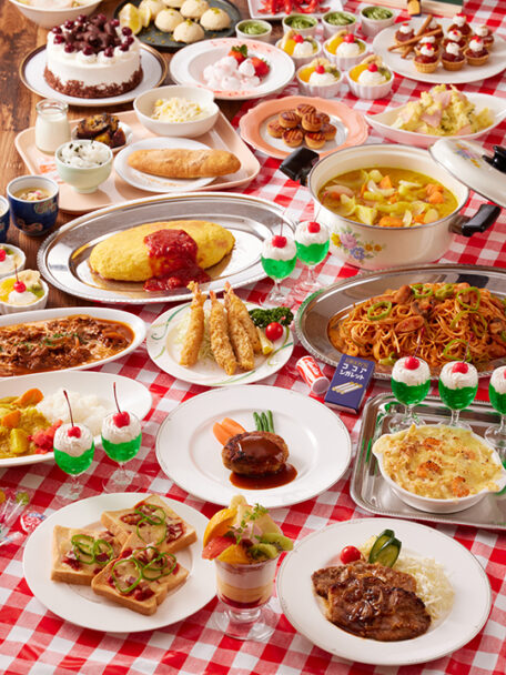 ハンバーグステーキやオムライス、中華そばなど、当時の喫茶店や洋食屋を思わせる人気メニューをシェフが目の前で仕上げます。ナポリタンやグラタン、エビフライなどの洋食定番メニューに加え、メロンソーダ風炭酸ゼリーやプリンアラモードなどのスイーツも登場。