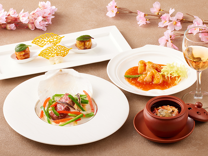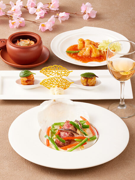 桜海老香るふかひれスープや北京ダック、国産牛サーロインなど、彩り豊かな逸品を組み合わせたコース。春の席を華やかに彩る広東料理です。