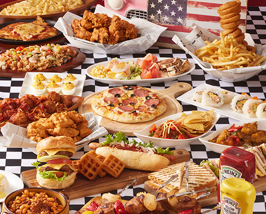 “アメリカンダイナー”をテーマに、ジャンバラヤやタコス風料理、フライドチキンなど食べ応えのある料理に加え、ディナー限定でビーフステーキ、ガーリックシュリンプのシェフサービスをご用意します。甘いスイーツとボリュームフードを、心ゆくまでお楽しみください。