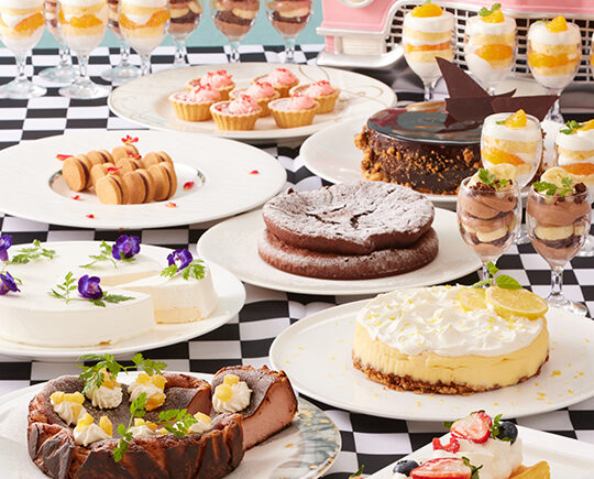 甘いスイーツはもちろん、アメリカンテイストの料理やシェフサービスも充実。前半・後半で一部メニューが変わり、期間中何度訪れても新しい味わいに出会えます。スイーツコーナーには、チョコレートケーキやガトーショコラ、チーズケーキやバスクチーズケーキなど、多彩なデザートがずらり。ランチタイムを華やかに彩ります。